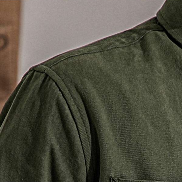大きめの胸ポケットと木製調のボタンが、クラシカルで落ち着いた雰囲気を演出しています。
