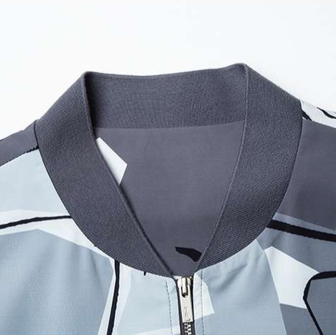 大胆な迷彩柄が特徴的なミリタリージャケットは、ジッパーポケットと伸縮性のある袖口でスポーティーな印象に。