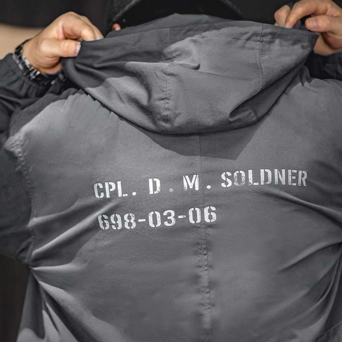 フィッシュテール形状や背面のプリントなど、従来の軍用パーカーの要素を取り入れた格好良さがあります。