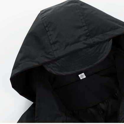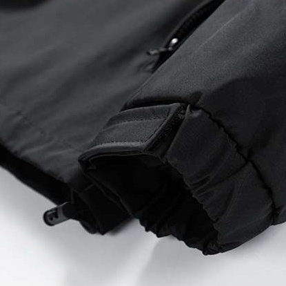 背面のストラップと袖のジップポケットが機能性を高め、フードと裾のドローコードで防風性を確保。