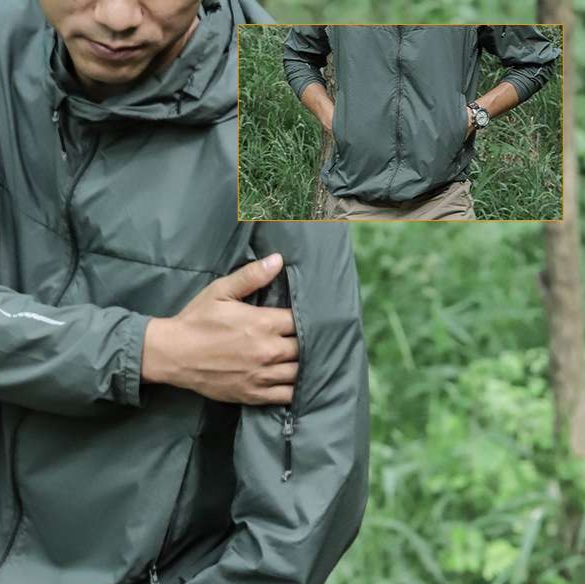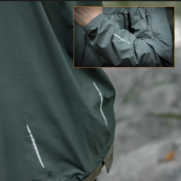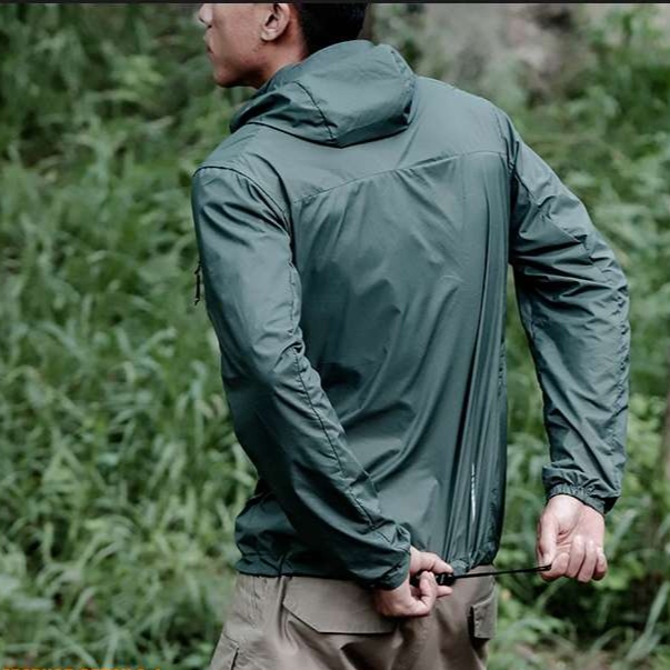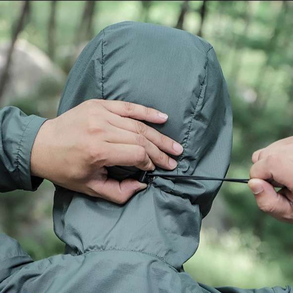防風・撥水性に優れた素材を採用し、フード付きで急な天候変化にも対応。