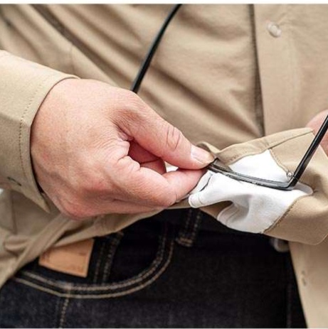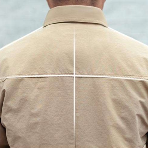 袖口の調節ボタンや襟元のステッチなど、実用的かつ洗練されたディテール