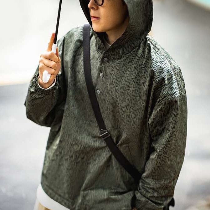 伸縮性に優れた素材を採用し、独特の凹凸感が魅力のプルオーバータイプのミリタリージャケット。フード付きでカジュアルなスタイルにも最適。都会的な雰囲気と実用性が調和したデザインは、アウトドアから日常使いまで幅広く活躍し、あなたの個性を引き立てる一着。ミリタリーテイストを取り入れたスタイリングが楽しめるアイテム。