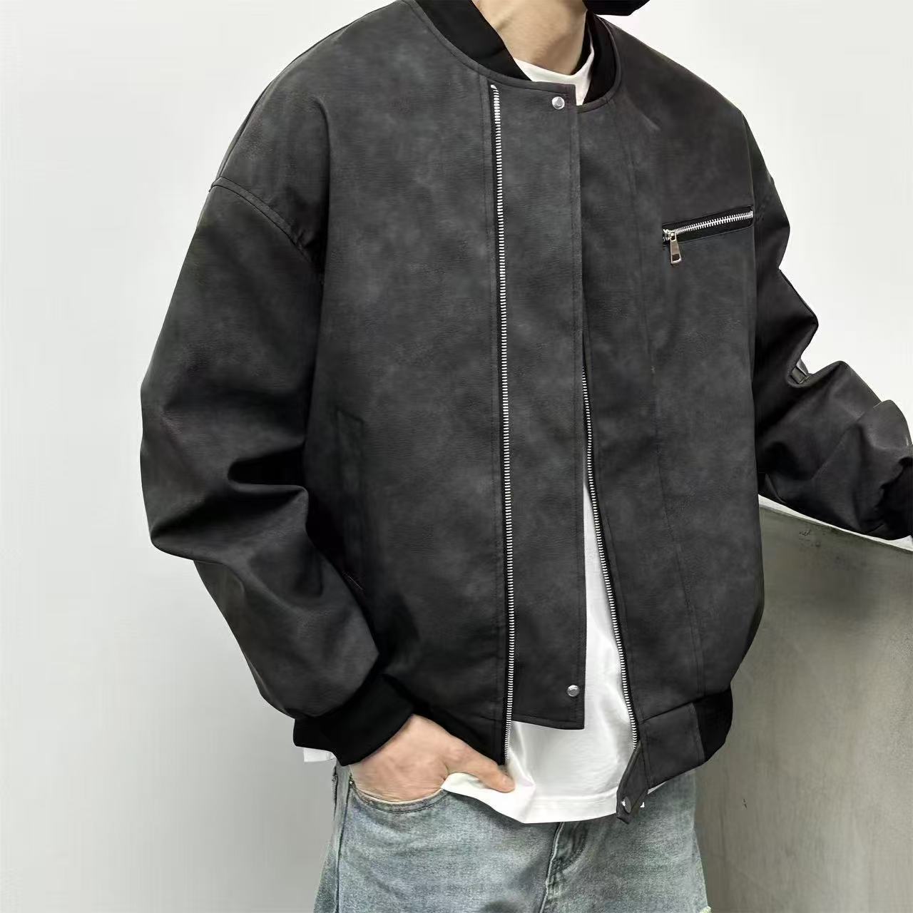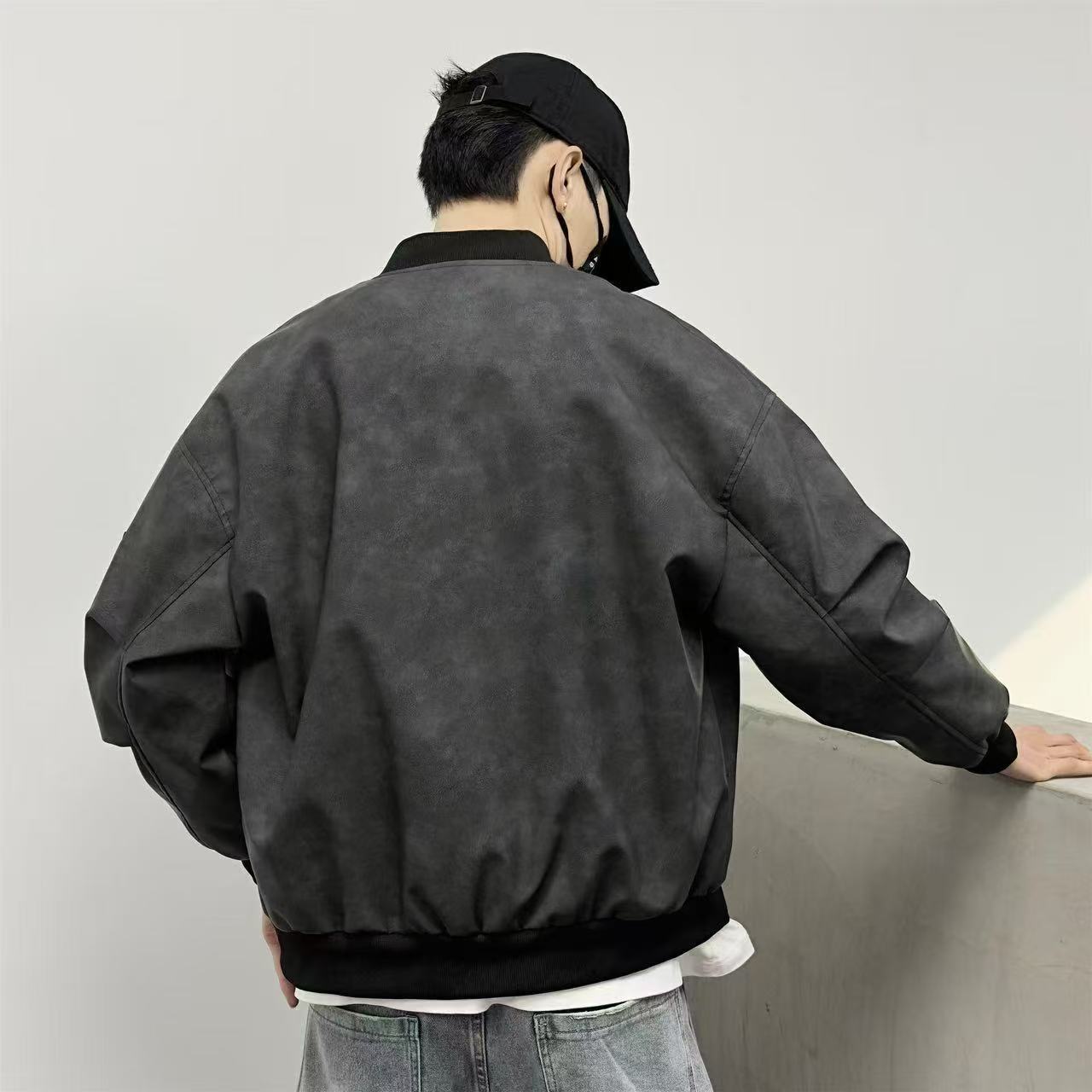 合成革素材を使用したミリタリージャケットは、カジュアルからきれいめスタイルまで幅広く対応します。