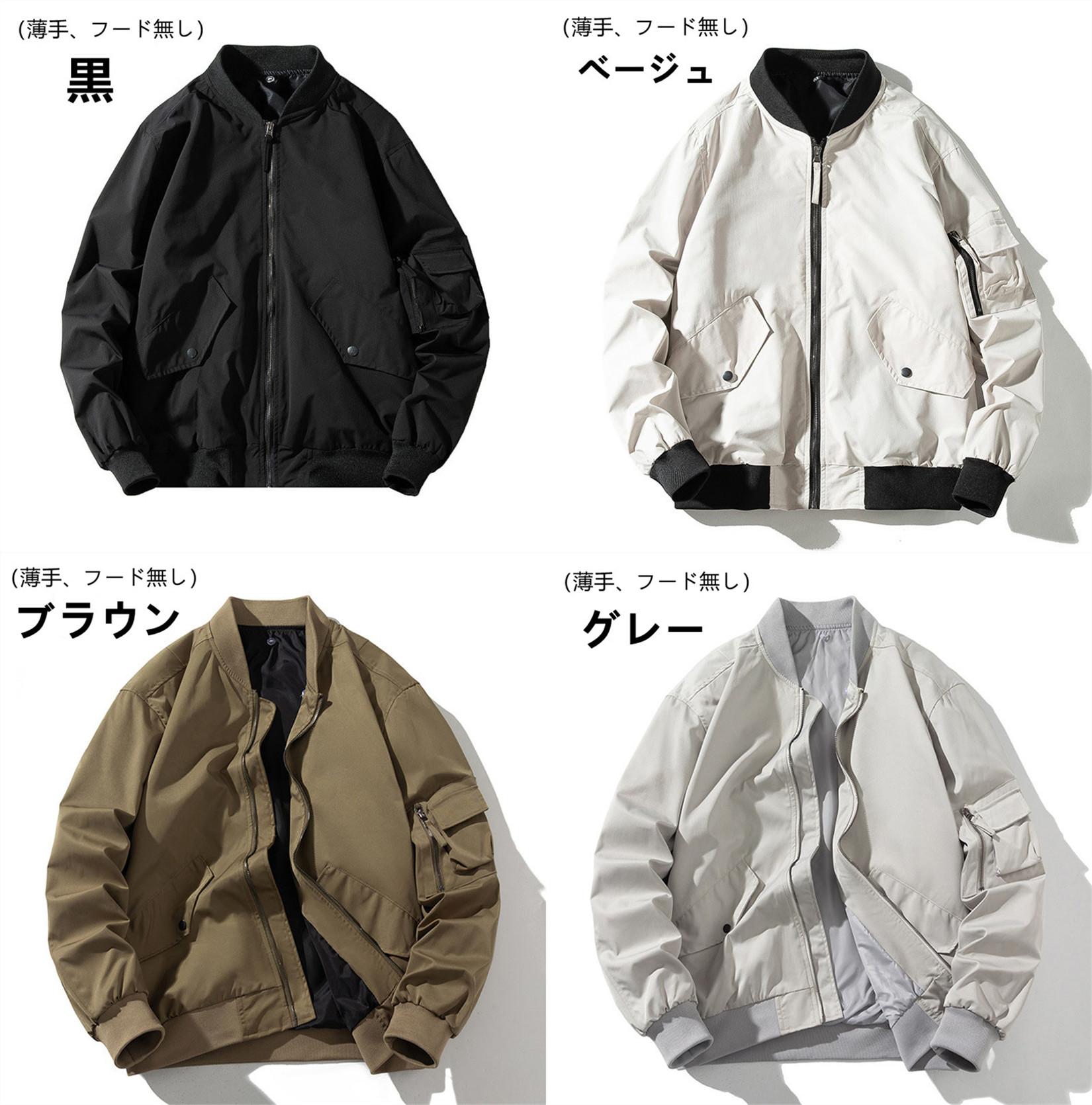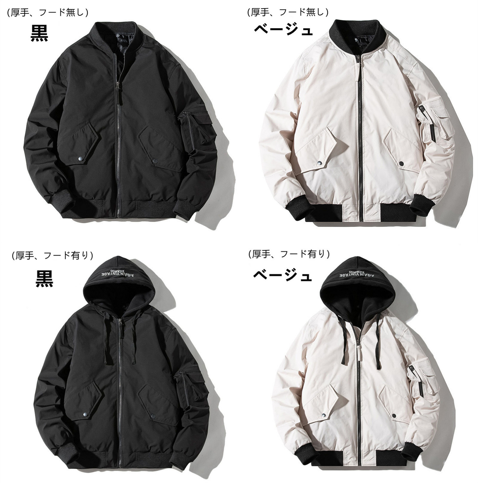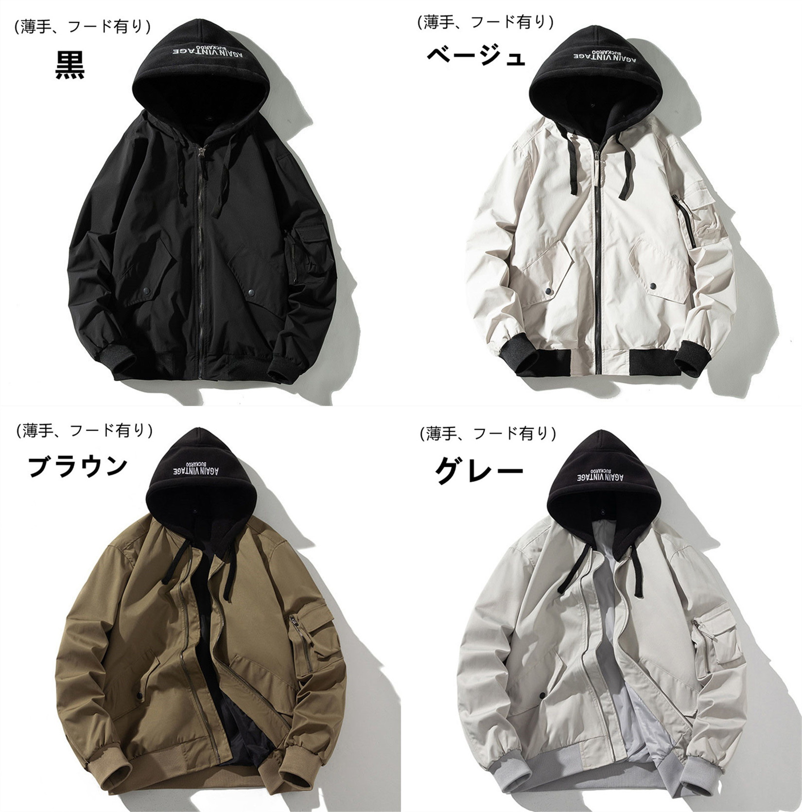 ■カラー:黒、ベージュ、ブラウン、グレー(薄手/厚手、フード無し/フード有り)