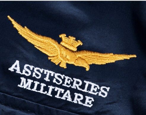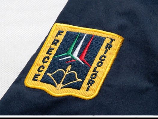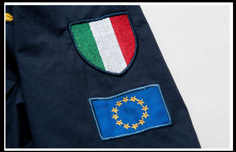 肩章や両胸のフラップポケット、袖や胸元に配された各国旗モチーフのワッペンが特徴的なミリタリージャケットです。