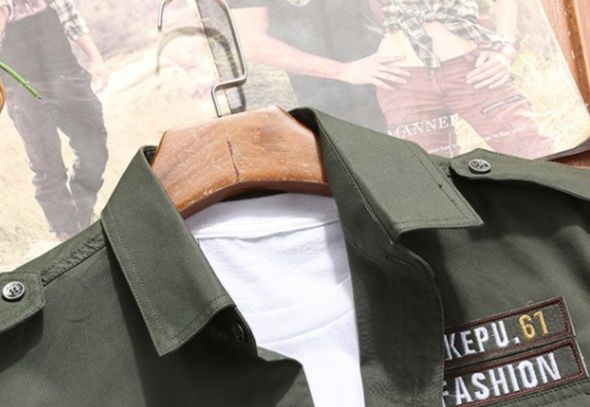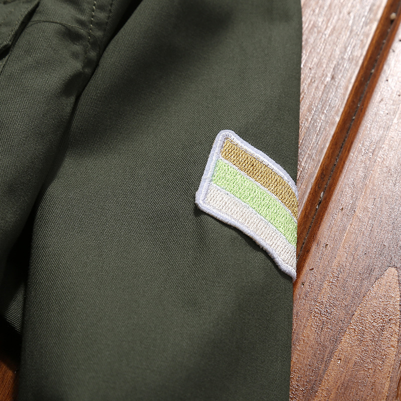 胸元の大きなフラップポケットと袖のワッペンが無骨な雰囲気を演出し、男らしいスタイルを完成させます。